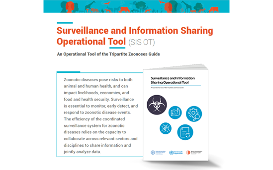 The Surveillance and Information Sharing Operational Tool (SIS OT) has been developed by the Tripartite organizations (FAO, WHO, WOAH) and technical experts to support national authorities to establish or strengthen their coordinated, multisectoral surveillance and information sharing for zoonotic diseases. Such a system is essential for early detection of disease events and timely, routine data sharing among all relevant sectors to support coordinated response, prevention, and mitigation of these events. While it provides step-by-step guidance on how to conduct each component of the process, it also provides an instrument for assessing the national coordinated surveillance and information sharing capacity already in place and linking users to a curated set of existing tools and resources that can help develop or improve that capacity.
