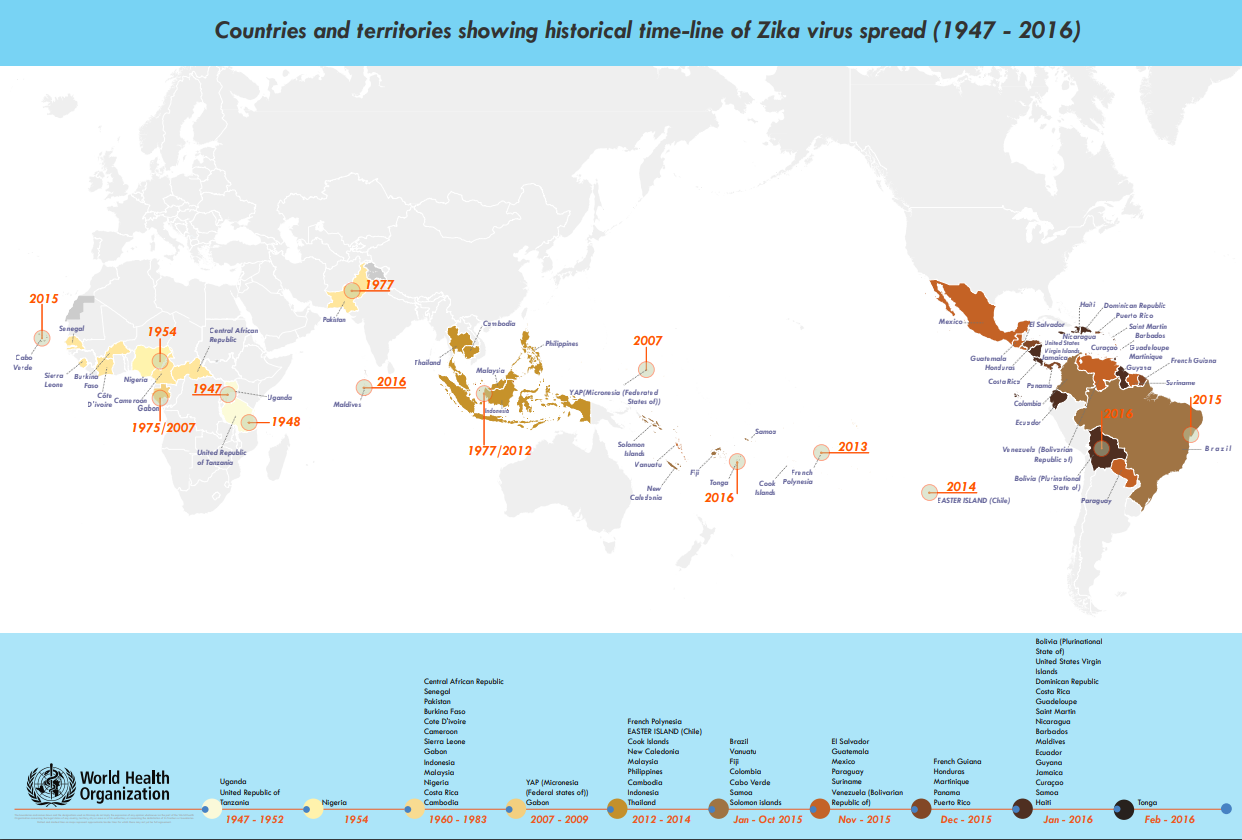 Figure 1. The temporal and geographical distribution of Zika virus from 1947 to February 2016. Dates refer to events reported in the published literature (cited in the text), or drawn from WHO’s Event Information Site (EIS).